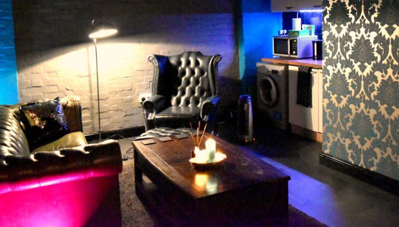 We’ve just added a massive black theatre curtain through the middle of the venue so it can be more flexible in it’s use. With the curtain left open we have a huge 60sqm dungeon space, ideal for all kinds of BDSM play. Closed off the curtain creates two distinct areas; a cosy domestic space, and a more play focused dungeon space.